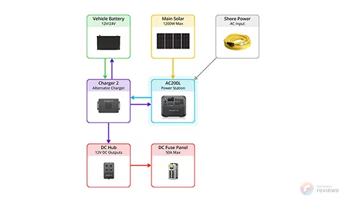 While the AC200L features a standard 12V/10A cigarette port, you can unlock its full 50A DC output to run your entire van (fridge, diesel heater, lights) by adding the following components:
