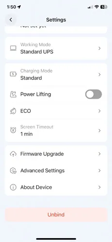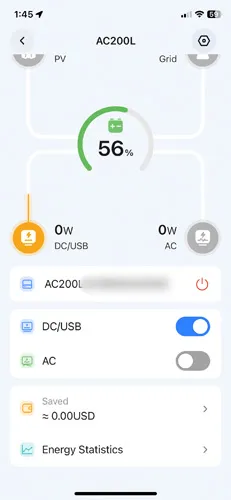 - Grouped Toggle: The device allows separate control of DC and USB, but the app merges them into one toggle, removing the ability to control them independently.
