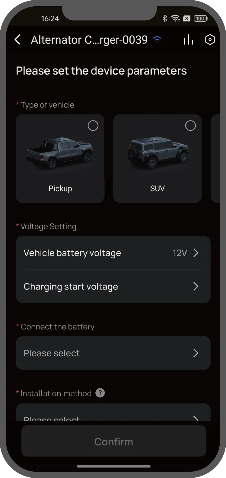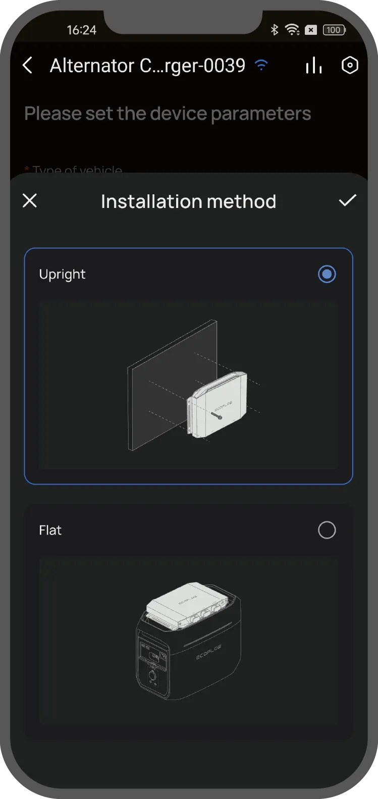 Before using the Alternator Charger for the first time, complete the initial setup in the EcoFlow app. The app will guide you through selecting your vehicle type, battery voltage, starting voltage, portable power station model, and installation methods (orientation).